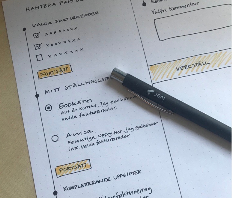 Jag började designprocessen med low-fidelity skisser för att visualisera viktiga funktioner för varje hatt. Dessa beskrevs i detalj för att fånga specifika användarflöden, såsom inloggning, notifikationer för fakturor, och själva godkännande/attesteringsprocessen. Skisserna baserades på den djupgående förståelsen för användares behov, framtagen genom intervjuerna.